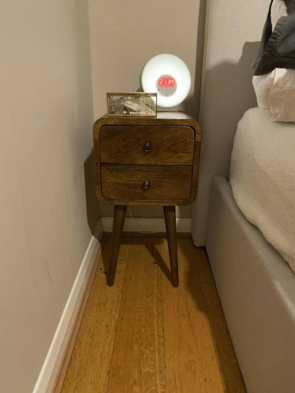 A compact bedside table crafted from 100% solid mango wood and finished in a deep chestnut tone. No veneers. No hollow panels. No flat-pack frustration.